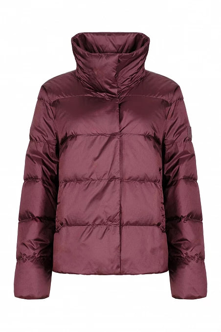 Женская бордовая куртка прямого кроя. Высокий воротник-стойка обеспечивает дополнительное тепло и уют. Регулярный узор горизонтальных стежков придает изделию аккуратный вид и объем. Прямые рукава доходят до запястий, обеспечивая свободу движений. Легкий блеск материала добавляет изысканности общему виду. Отличный выбор для создания стильного и функционального зимнего образа.