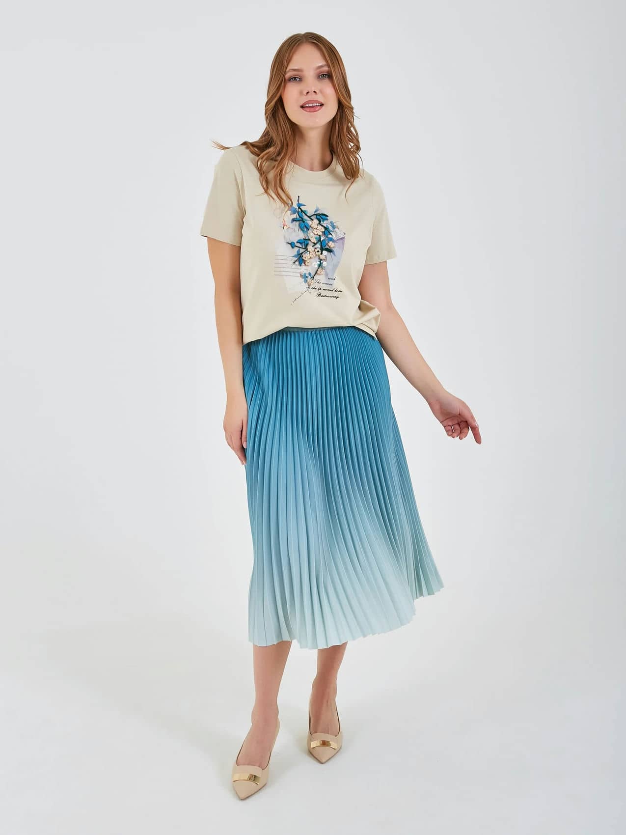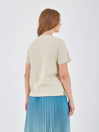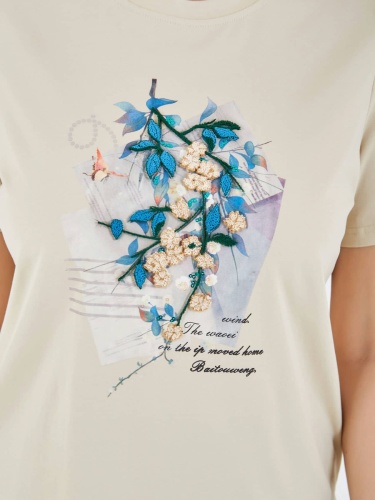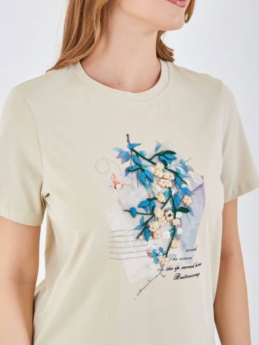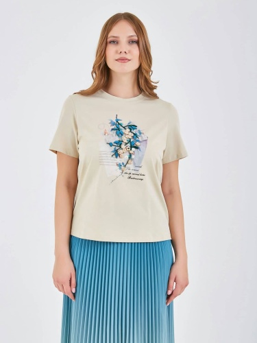Футболка светлого бежевого цвета с декоративным принтом, на котором изображены цветы и листья в ярких голубых и зеленых оттенках. Ненавязчивый текст на принте и округлый воротник придают изделию стильный и женственный вид, идеально подходящий для повседневной носки. Коллекция Весна-Лето 2025. Капсула "Марракеш". Параметры модели: 95-64-101, рост 175, размер 44-46