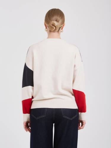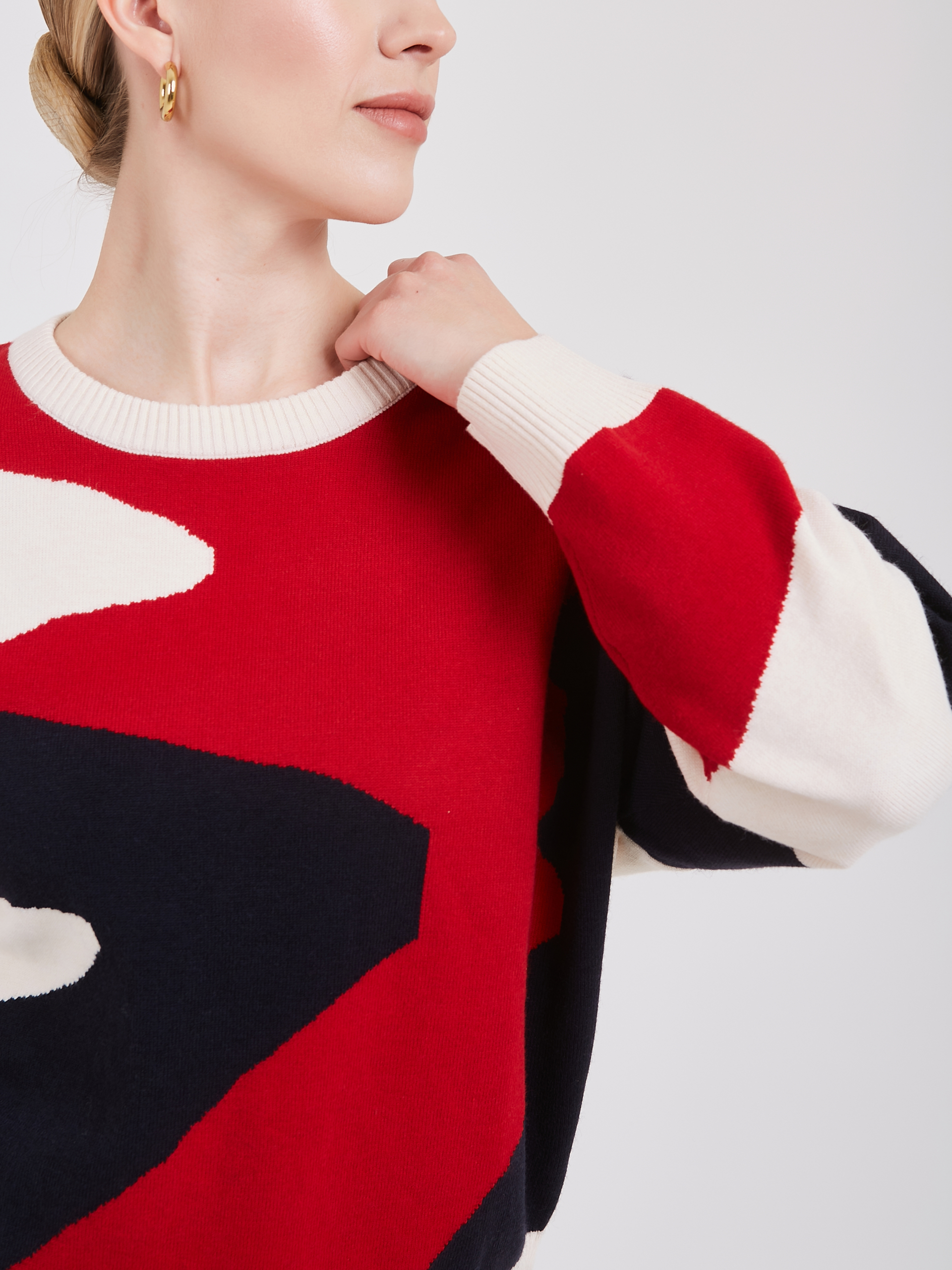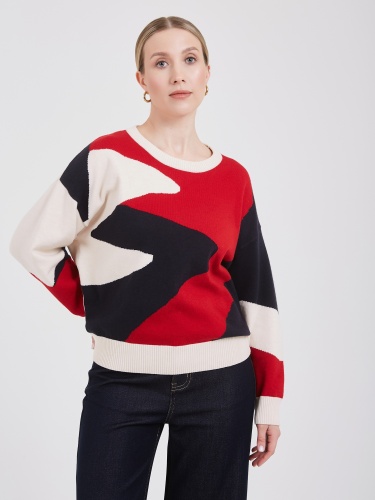 Свитер свободного силуэта с абстрактным узором. Узор выполнен крупными красными, тёмно-синими и кремовыми блоками, создавая динамичный и современный рисунок. Круглый вырез и длинные рукава подчёркивают комфорт и свободу движений. Качественная пряжа обеспечивает мягкость и тепло, делая изделие идеальным выбором для осенне-зимнего сезона. Осень-Зима'25/26. Капсула "Алые Паруса"